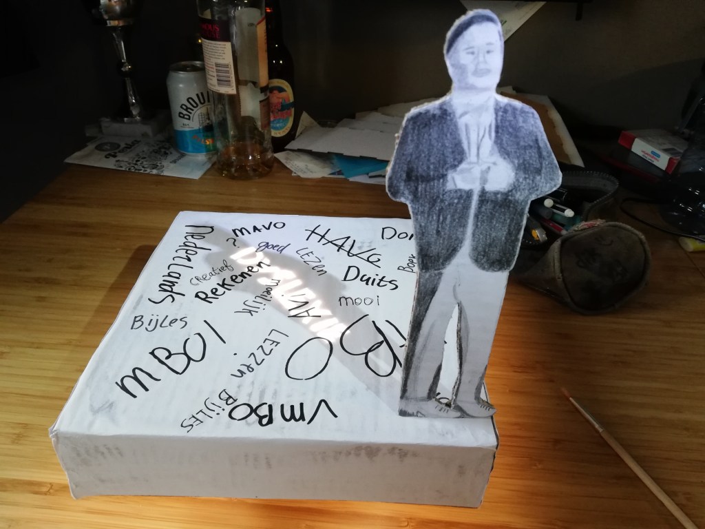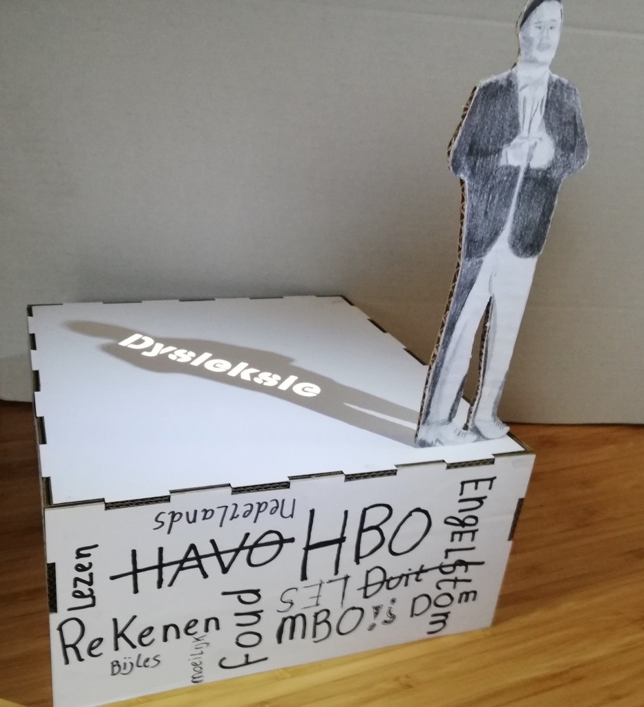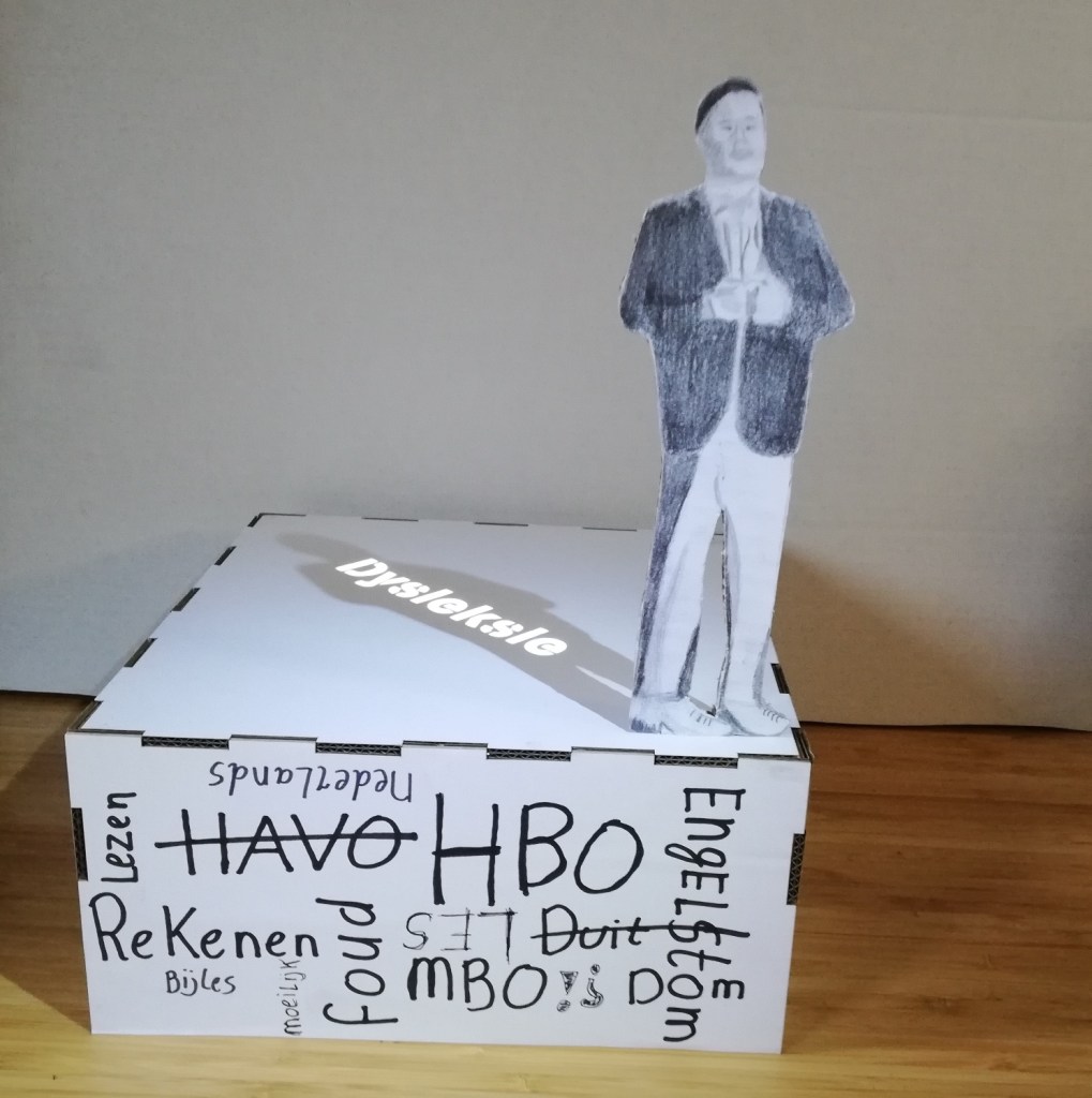 Voor een schoolproject kreeg ik de opdracht om een stellage te maken over een onderwerp wat mij aan het hard ligt. Ik heb gekozen voor dyslexie omdat dit iets is wat mij altijd heeft belemmerd in mijn onderwijs traject. Nu ik bezig ben met mijn bacheloropleiding kan ik zeggen dat ik trots ben op wat ik heb bereikt. Vanuit deze gedachten ben ik begonnen met de stellage. Ik wou mezelf op een trotse manier portretteren.